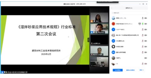 中國散協團體標準《濕拌砂漿應用技術規程》第二次標準編制工作會議于2020年5月22日上午9:30-11:30以網絡會議的形式召開。中國散裝水泥推廣發展協會秘書長、建筑材料工業技術情報研究所混凝土發展中心主任孫繼成博士、中國散裝水泥推廣發展協會專家委員計海霞高工、建筑材料工業技術情報研究所標準編制工作組楊莉、中建西部建設北方有限公司技術中心經理張凱峰、成都精準混凝土有限公司經理馬占民、山東弗爾曼新材料集團有限公司經理肖維錄、主任薛俊書、廣東浪淘砂新型材料有限公司研發中心主任曹小榮、黃山精強建材股份有限公司副總經理程楷、四川同舟化工有限公司技術片區負責人鄧奎、中信國安建工集團有限公司總工張學華、麗水市處州混凝土有限公司總經理楊磊、實驗室主任金滿昌;株洲市中建新材料有限公司總經理陳新、青島國基商砼有限公司郇建、昆明匯森混凝土有限公司杜顯茂等41名代表參加了會議。會議由建筑材料工業技術情報研究所楊莉主持。首先主編單位中國散裝水泥推廣發展協會秘書長、建筑材料工業技術情報研究所孫繼成博士介紹了標準編制要求以及編制工作進度計劃。隨后,中國散裝水泥推廣發展協會專家委員、主編單位標準編制負責人計海霞高工就濕拌砂漿行業現狀、標準中創新點和關鍵點進行介紹。標準編制組建筑材料工業技術情報研究所楊莉詳細介紹了標準文本及條款編制說明,并組織參會代就凝結時間、保塑時間、14拉伸粘結強度等關鍵技術參數進行交流討論,廣泛征集參編單位意見。該會議的召開對標準編制工作起到了大的推進作用。標準編制負責人計海霞高工標準編制組工程師楊莉